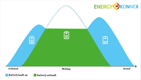 Met een energieopslagsysteem (batterij) kunnen bedrijven makkelijk de piekvraag ook wel piekbelasting verlagen. Tijdens de piekuren schakelt de batterij in. De batterij laadt tijdens daluren op met zonne-energie of slim vanaf het energienet. De pieken kosten veel minder als er op het piekmoment energie uit de batterij wordt gehaald in plaats van de extra kosten die in rekening gebracht worden door de netbeheerder.
