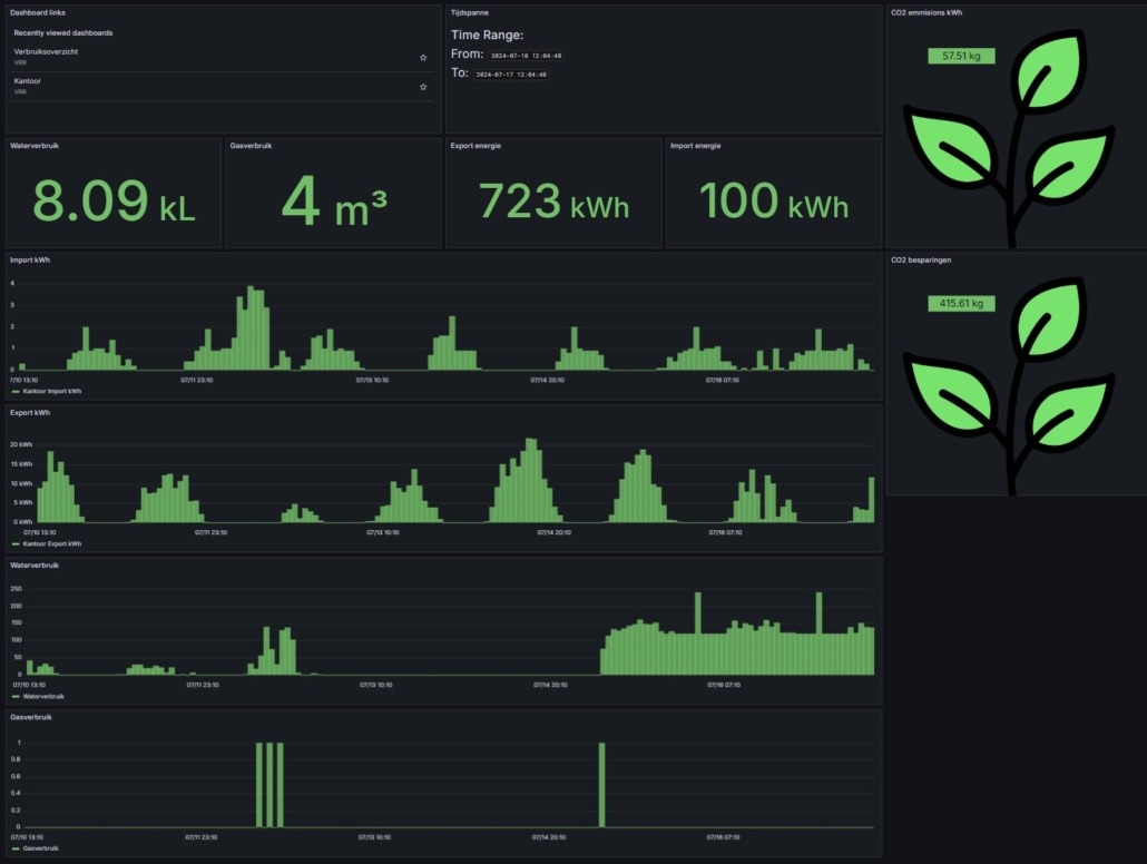 Alle data wordt realtime zichtbaar in een overzichtelijk dashboard. Daarnaast ontvangt het bedrijf maandelijks automatische rapportages van gas-, water-, en elektriciteitsverbruik én CO2-uitstoot.